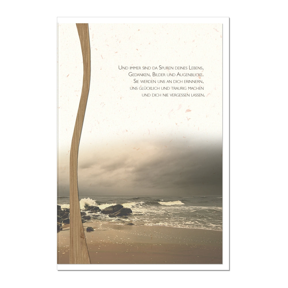 Die Wellen am Strand stehen für Vergänglichkeit und den ewigen Lauf des Lebens. Das Zitat „Und immer sind da Spuren deines Lebens, Gedanken, Bilder und Augenblicke. Sie werden uns an dich erinnern, uns glücklich und traurig machen und dich nie vergessen lassen.“ (anonymer Sinnspruch) bringt liebevolle Erinnerung und bleibende Verbundenheit einfühlsam zum Ausdruck.