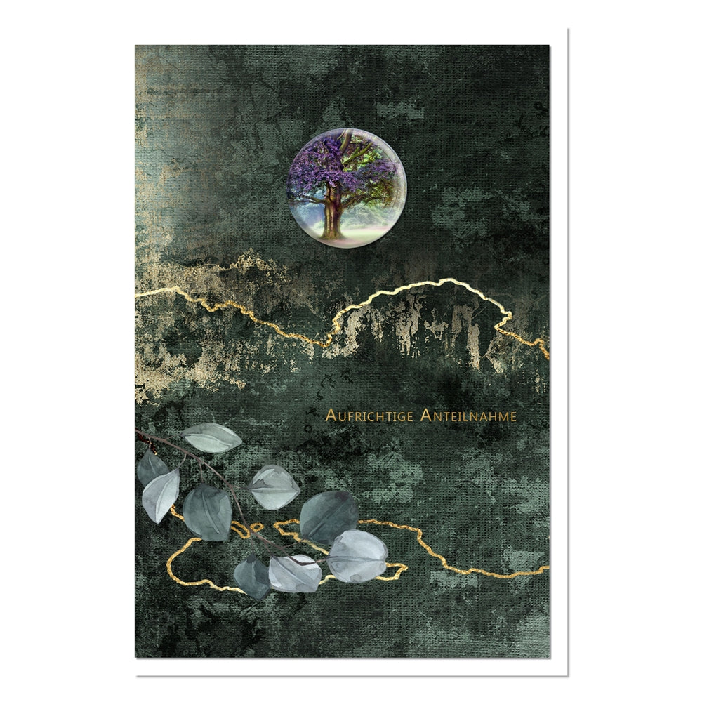 Diese edle Trauerkarte im Format B6 zeigt einen tiefgrünen, strukturierten Hintergrund mit warmen Goldakzenten, die wie leuchtende Konturen über die Oberfläche fließen. Im oberen Teil befindet sich eine runde 3D-Kunstharzverzierung mit einem farbenprächtigen Baum in Violett- und Grüntönen, der symbolisch für Lebensweg, Übergang und inneren Frieden steht. Im unteren Bereich ergänzen dezente Eukalyptusblätter die ruhige, natürliche Ästhetik.