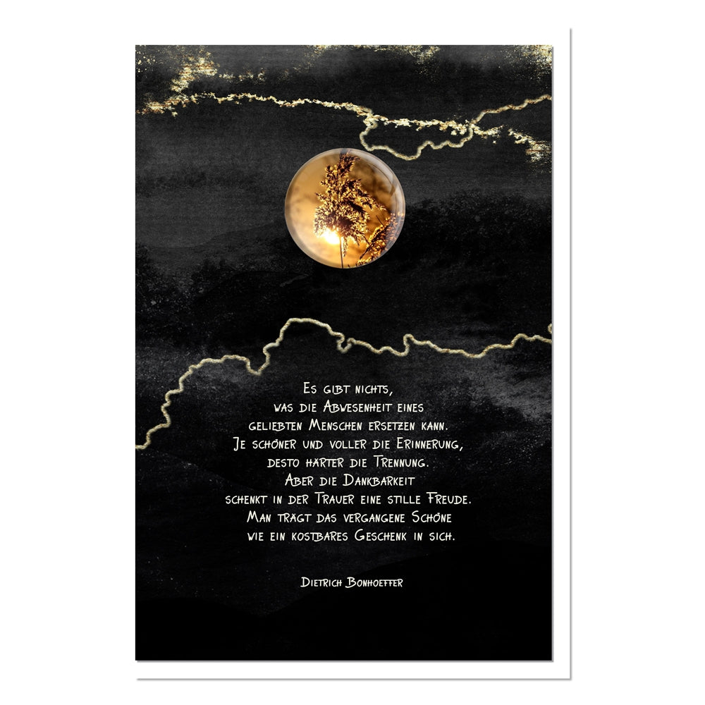 Das Zitat von Dietrich Bonhoeffer spricht vom Verlust und von der Kraft der Dankbarkeit, die auch in der Trauer bestehen bleibt: