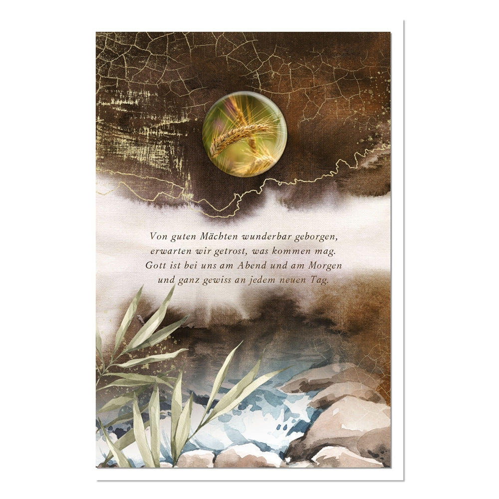 metALUm Trauerkarte B6 mit 3D-Kunstharzverzierung – Motiv Ähren & Wasser in Braun-Grün – Von guten Mächten