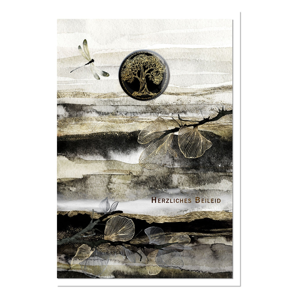 Der schlichte Schriftzug „Herzliches Beileid“ fügt sich dezent in das Gesamtbild ein. Die Libelle steht als Sinnbild für die Seele und den Übergang, während der Lebensbaum für Kontinuität und Hoffnung steht. Gemeinsam schaffen sie eine Atmosphäre des Friedens und der stillen Verbundenheit.
