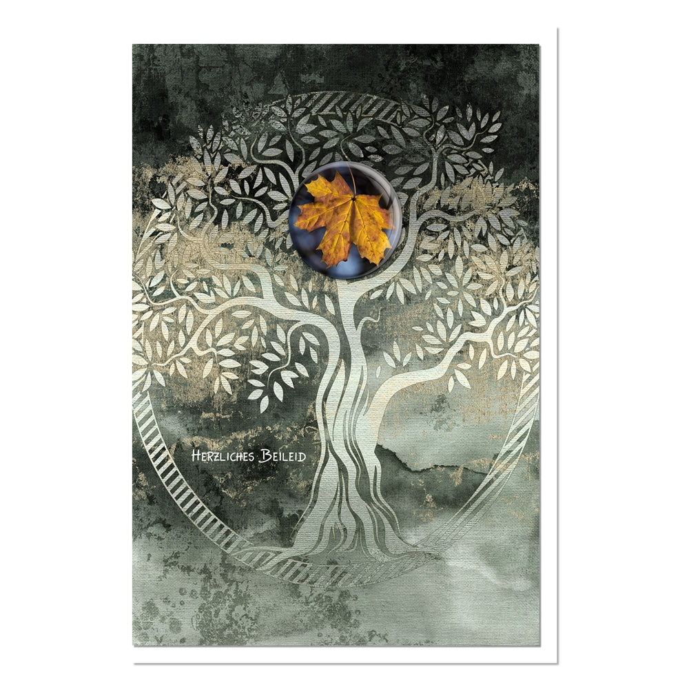metALUm Trauerkarte B6 mit 3D-Verzierung – Motiv Lebensbaum mit Herbstblatt – Herzliches Beileid